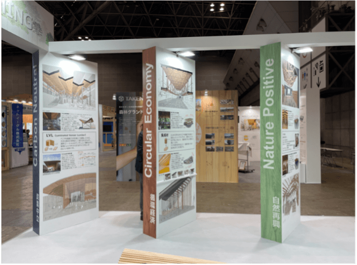 木造をはじめとする建築における環境問題に対しての問題提起と当社の取組を紹介しました。炭素中立に対しては、ホールライフカーボンの設計施工物件全件算出、循環経済については、建築発生残土のアップサイクルそして生物多様性については飛騨の広葉樹活用についてそれぞれ展示を行いました。