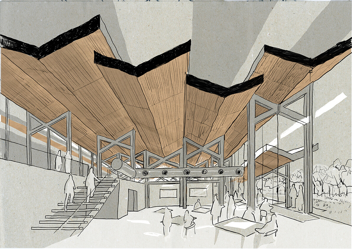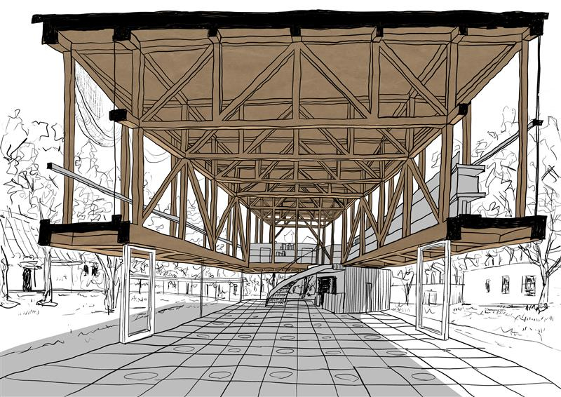 ブース内側の三面には、アーティストの座二郎さんに描き下ろしていただいた木構造のダイナミックなイラストを展示しています。木造建築は写真で見るとその複雑さがそのまま伝わりますが、イラストでシンプルに表現することで、よりその美しさや迫力が際立ち、同時に構造がわかりやすくなります。今回はその絵をハガキにして配布し、多くの皆さまに大変喜んでいただきました。