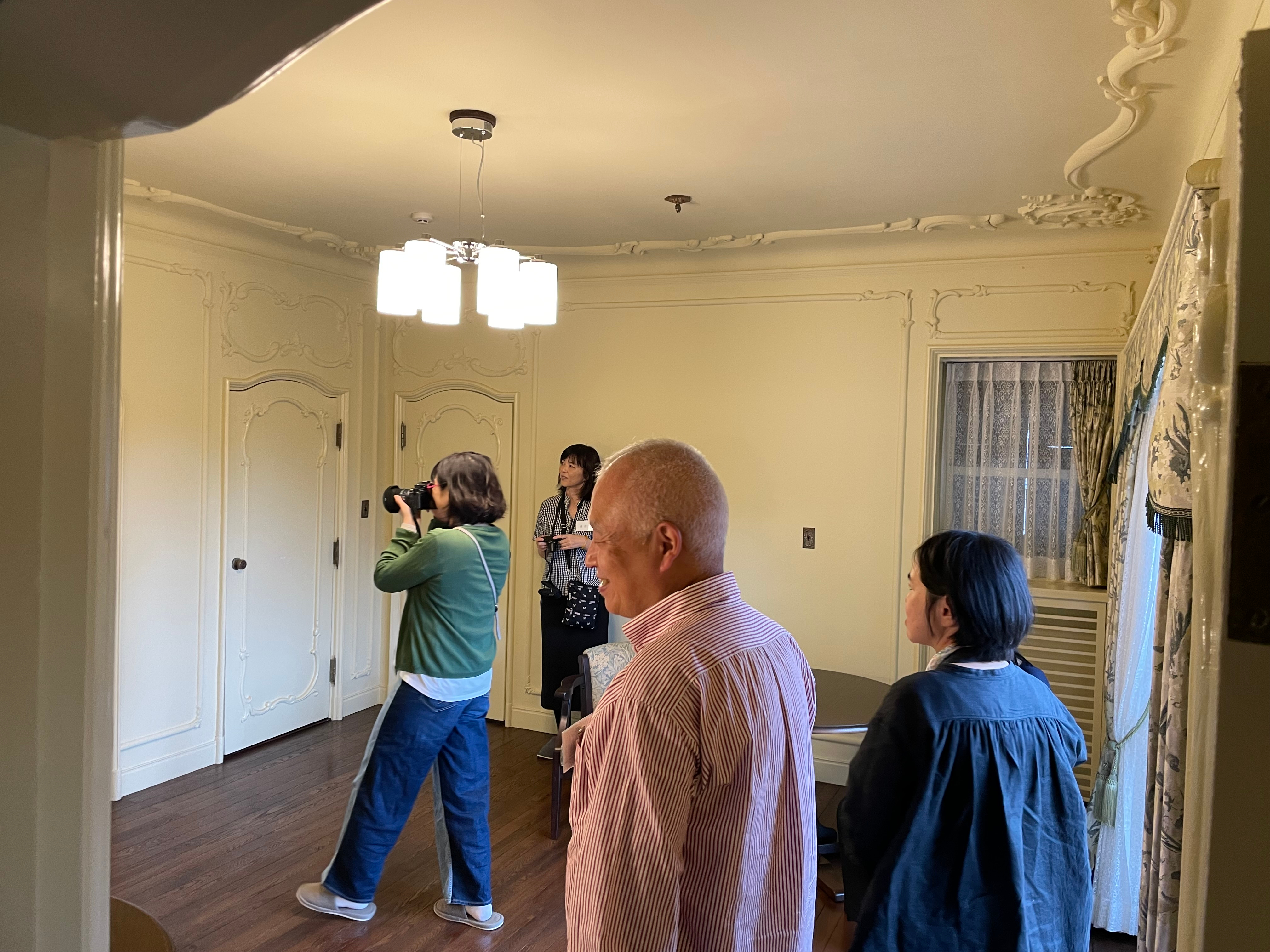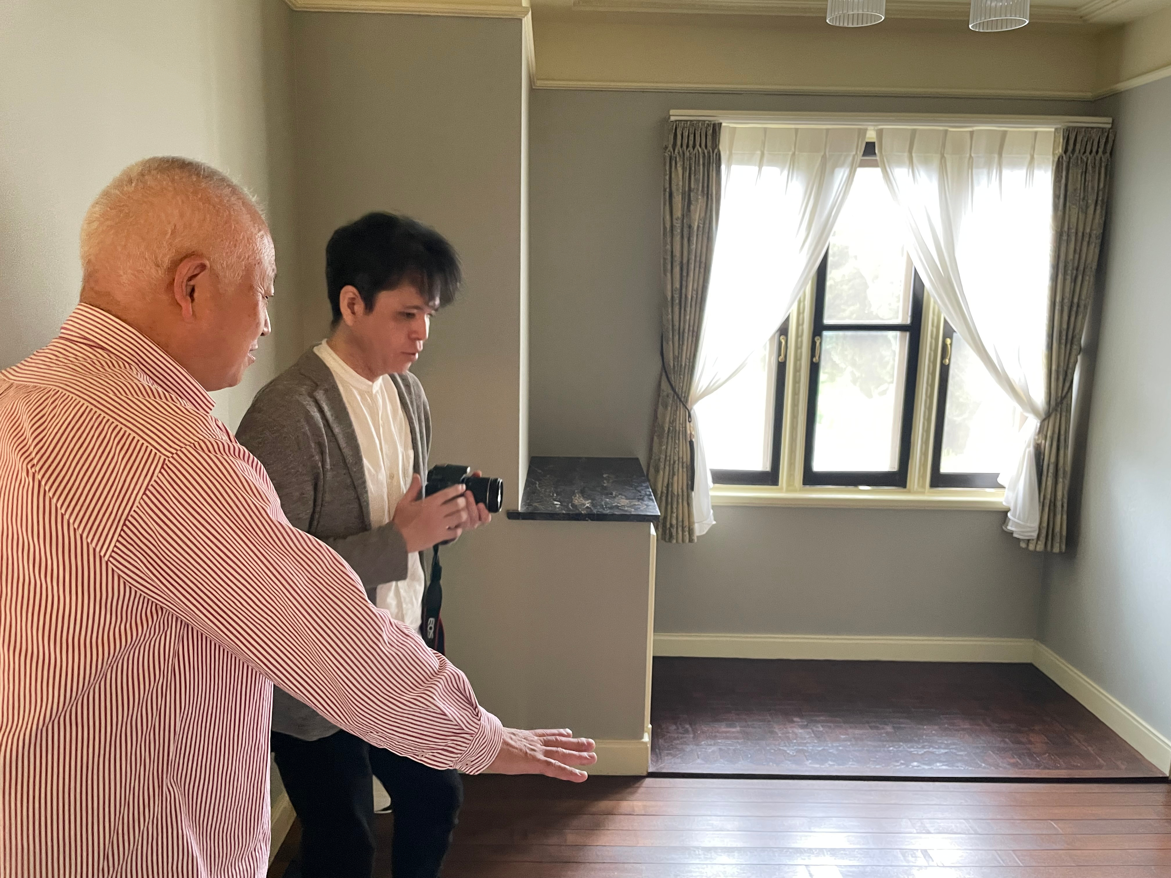 ▲2階夫人室の三越製作り付け家具を、どううまく撮影するか教えています