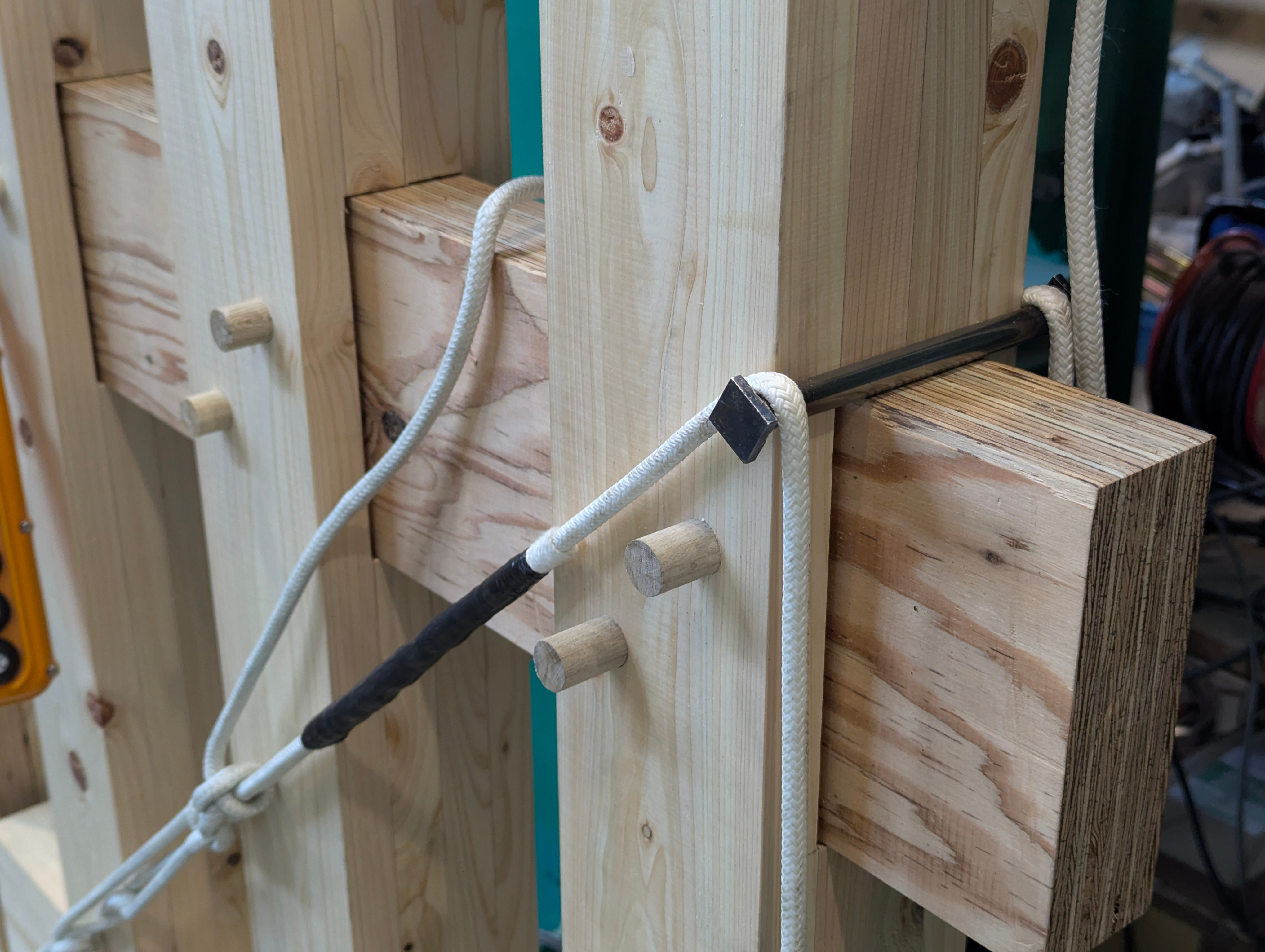 ▲丸鋼にロープをかけて滑車としての挙動を期待