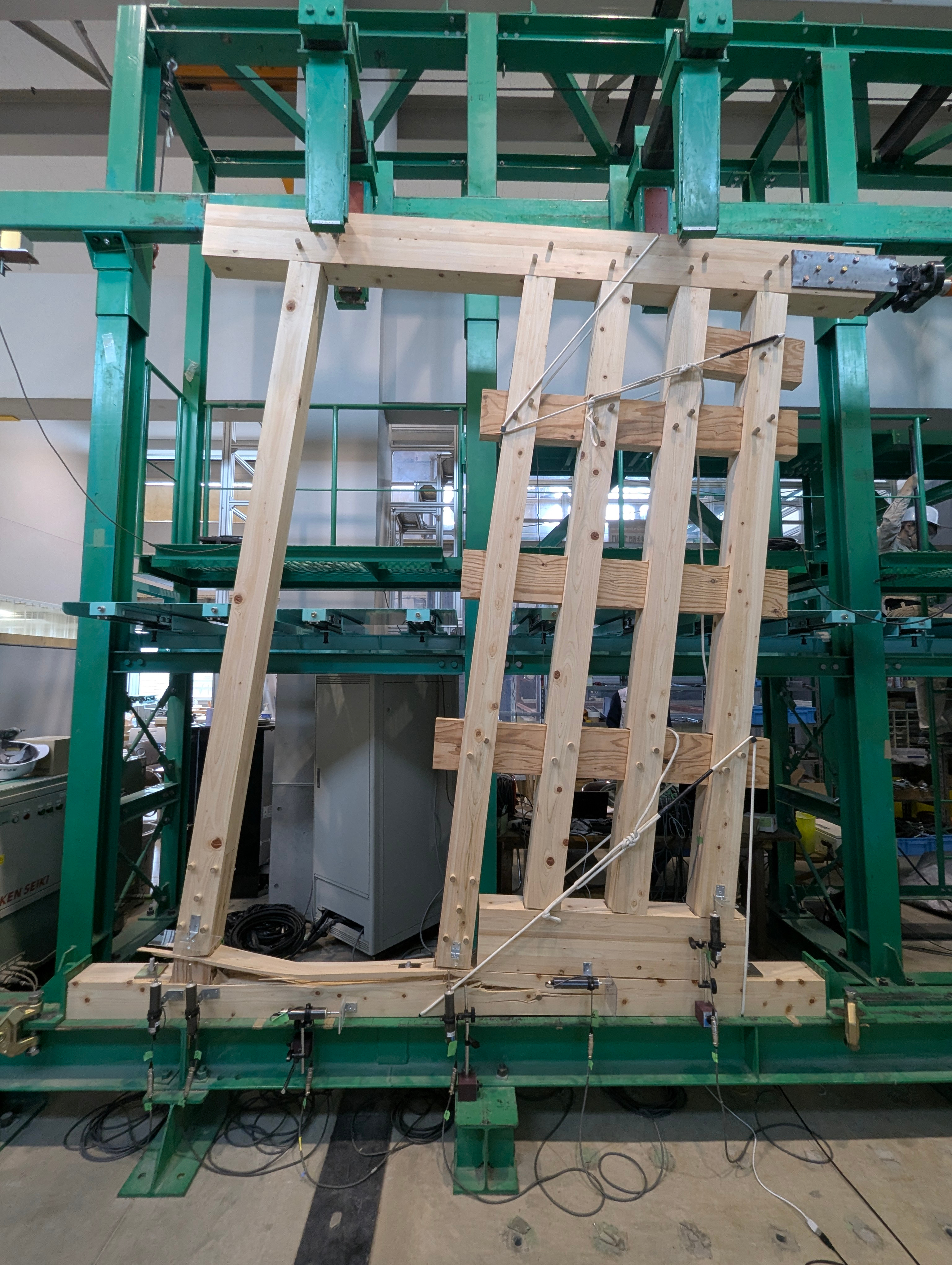 また今年からは金沢工業大学河原研究室との共同チーム「前田建設金工大支店」として参加し、河原研究室には、予備試験や金物の作成、施工方法の検討などを行ってもらいました。予備試験では、事前の解析結果と実際の変形との比較や破壊性状の観察を元に耐力壁の改良を行います。
