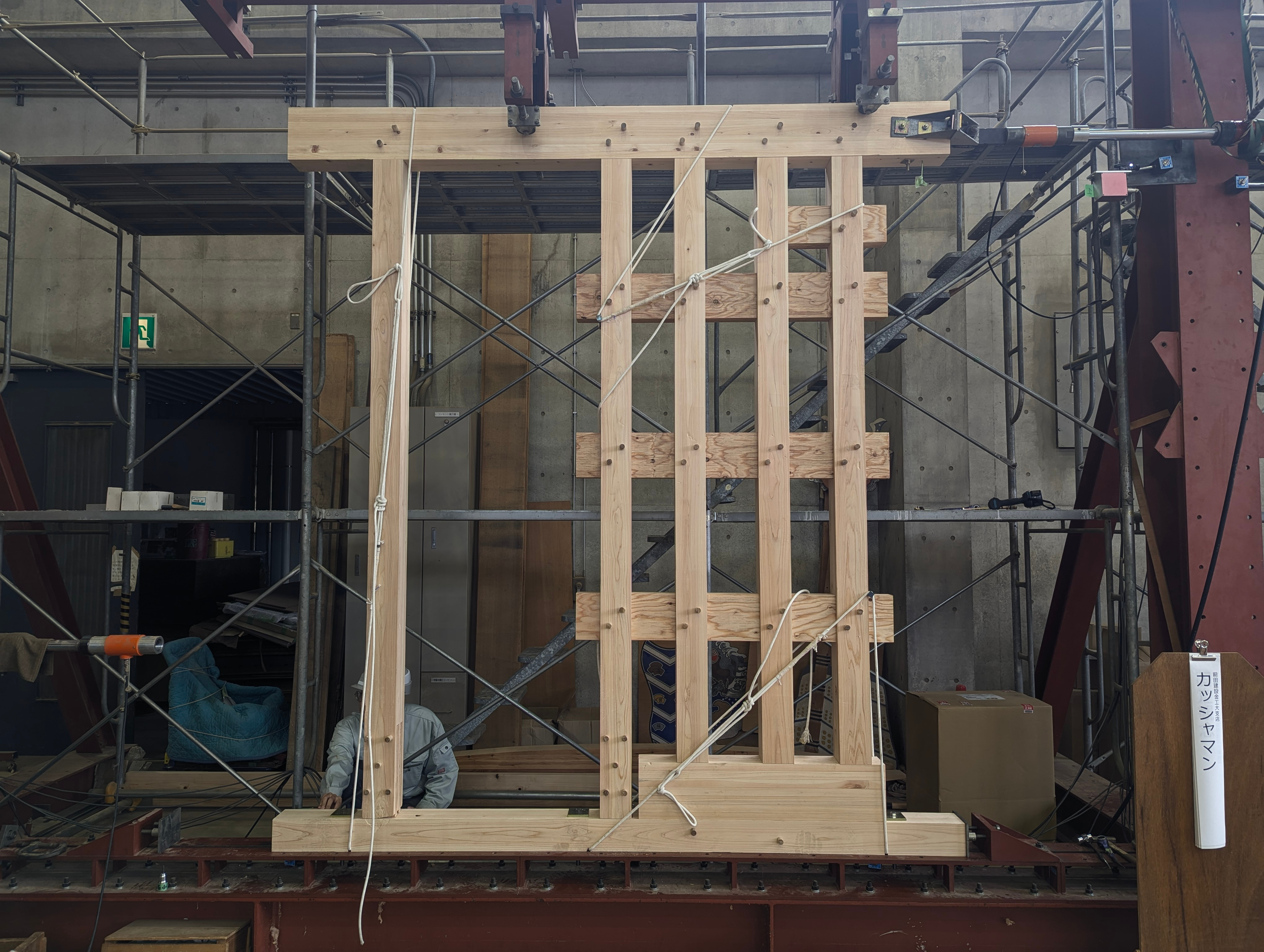 毎年、カベワンGPに出場するにあたって、単に良い結果を目指すだけではなく、挑戦的な面白い構造の耐力壁を設計しています。今年は、アラミド繊維という高耐力・高剛性の繊維で作られたロープを使って、滑車の機構を取り入れた耐力壁「カッシャマン」で出場しました。