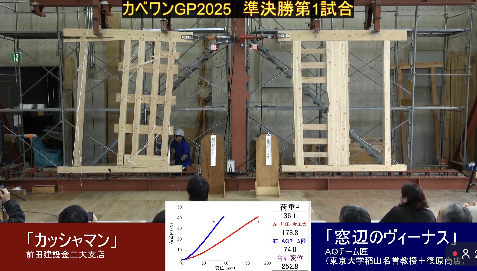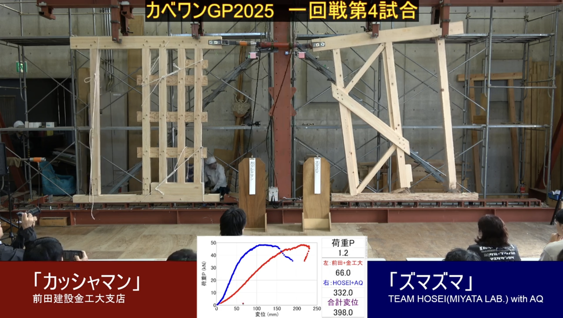 一回戦目ではTEAM HOSEI(MIYATA LAB)with AQとの対戦でした。相手の耐力壁は土台にパララムという強度の高い木質材料を使い、柱脚をビスで固定した高強度の期待される耐力壁でしたが、接戦の末、前田建設工業チームの耐力壁の勝利となりました。