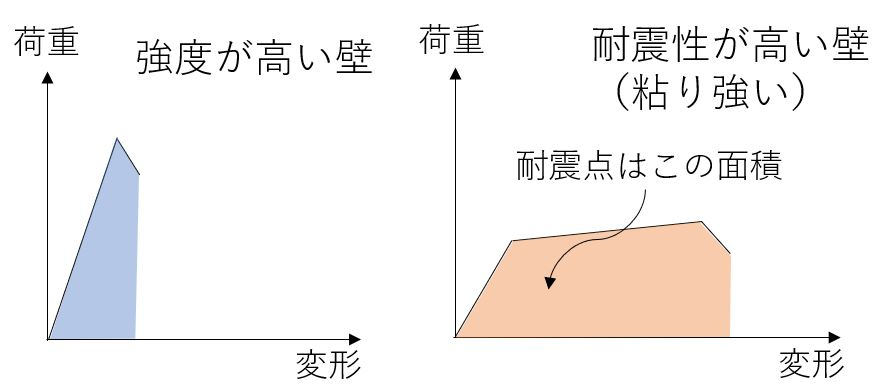▲耐震点の算出方法(左の壁の方が耐力は高いが、右の壁の方が靭性(粘り強さ)があり耐震点は高くなる)