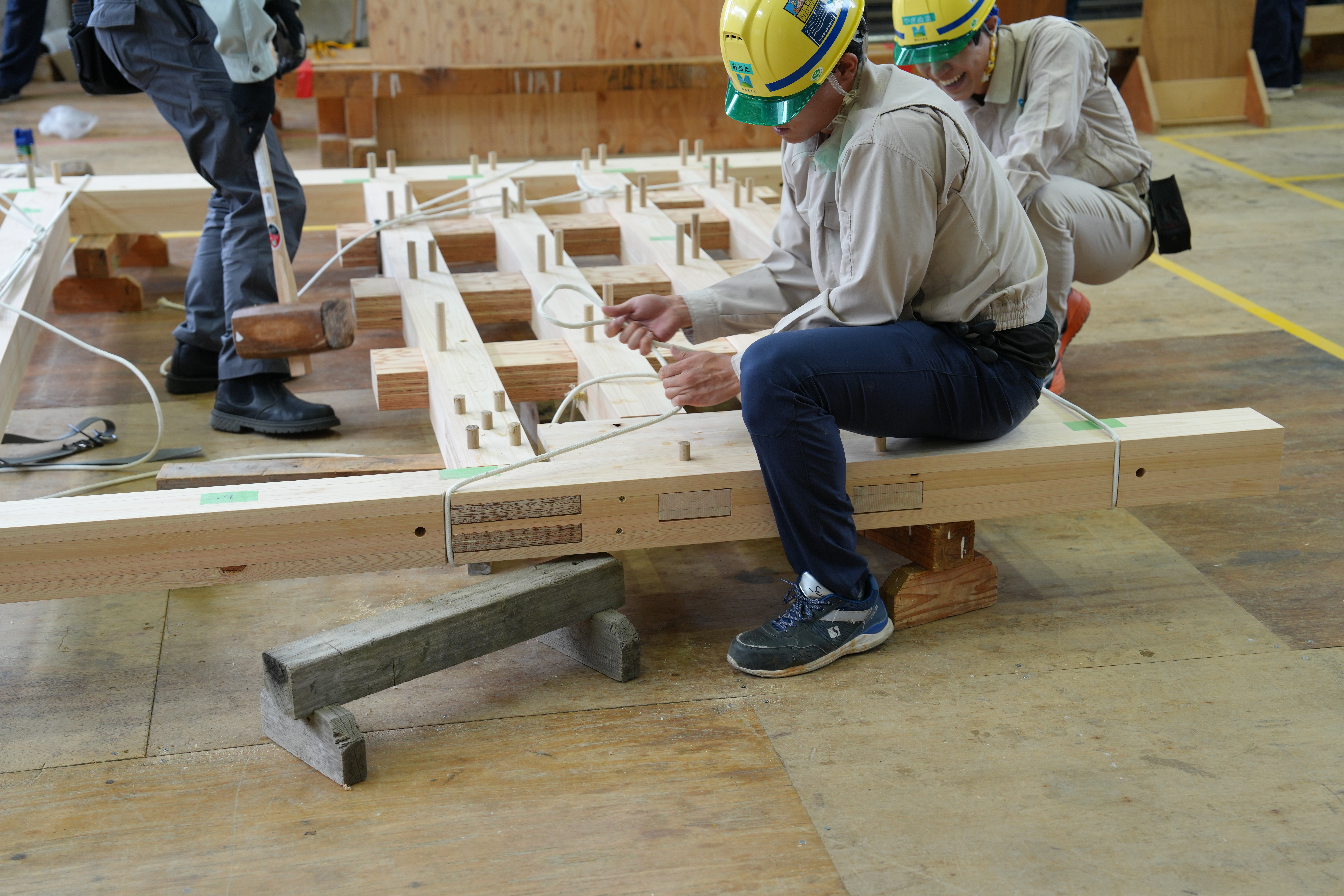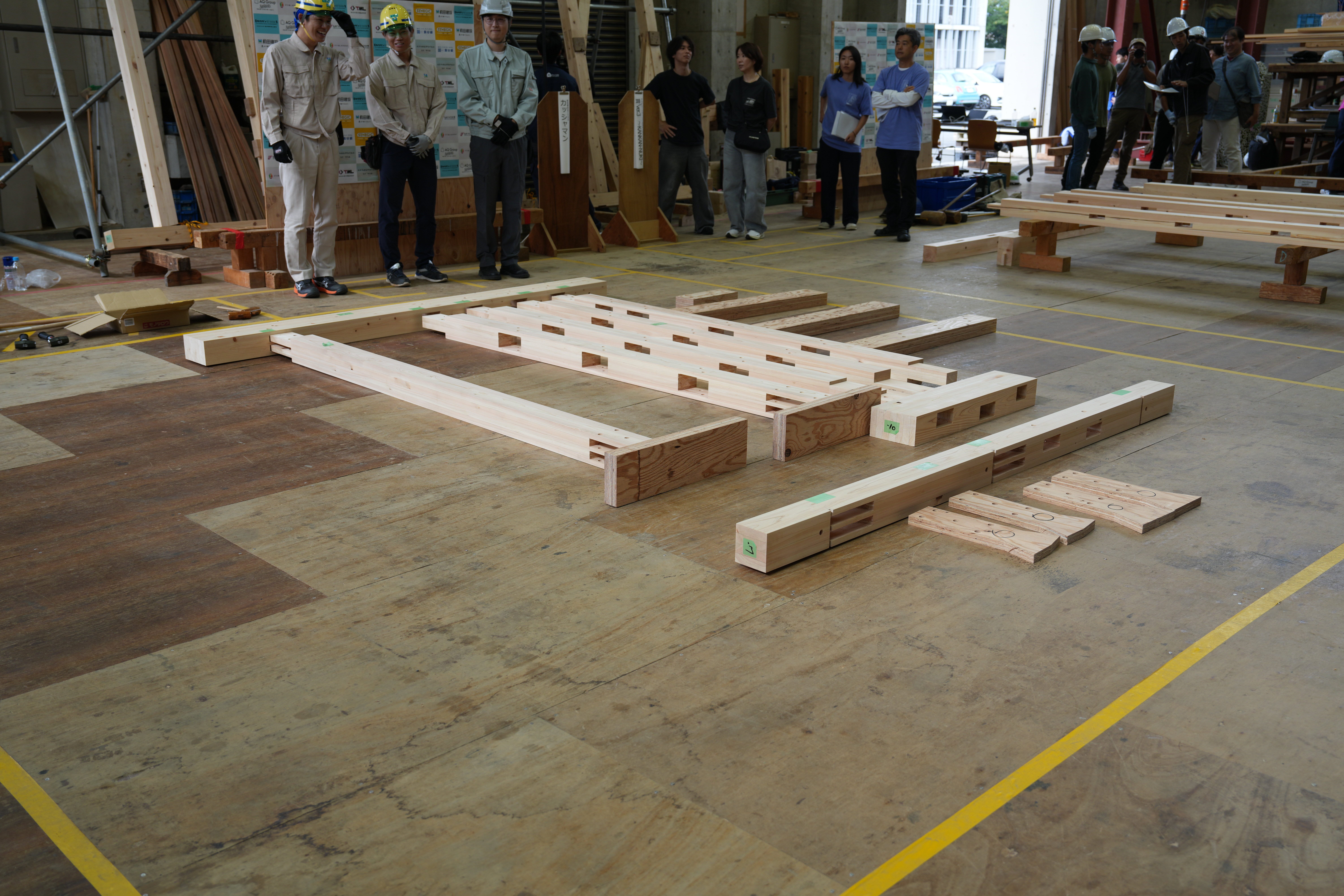 大会当日は自分たちの手で耐力壁を施工しなければなりません。例年、前田建設工業チームは大会で最小人工での施工となるように事前によく施工方法を検討して挑んでいますが、今年は木材加工のクリアランスが小さかったこともあり、例年よりも施工に時間がかかってしまいました。