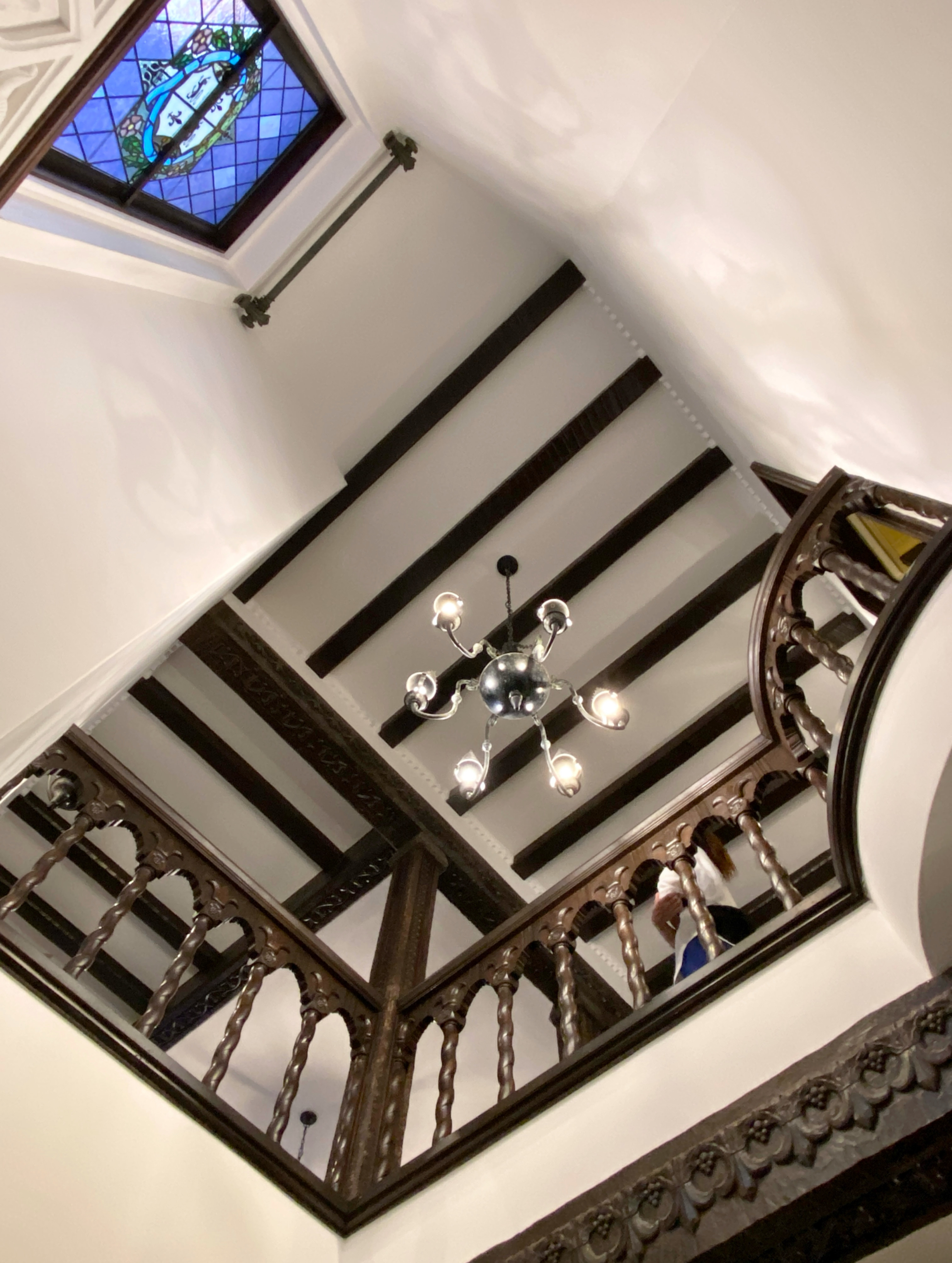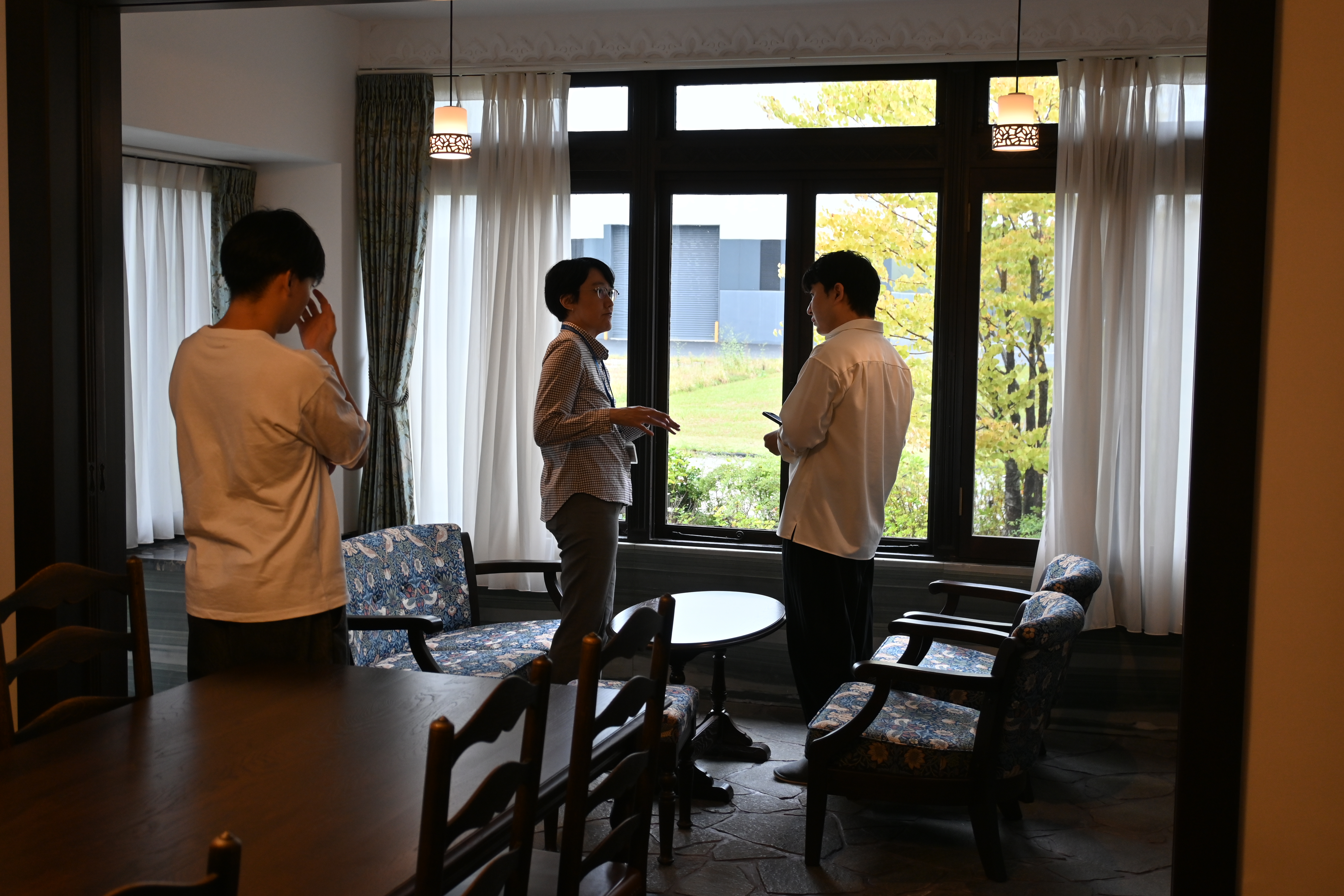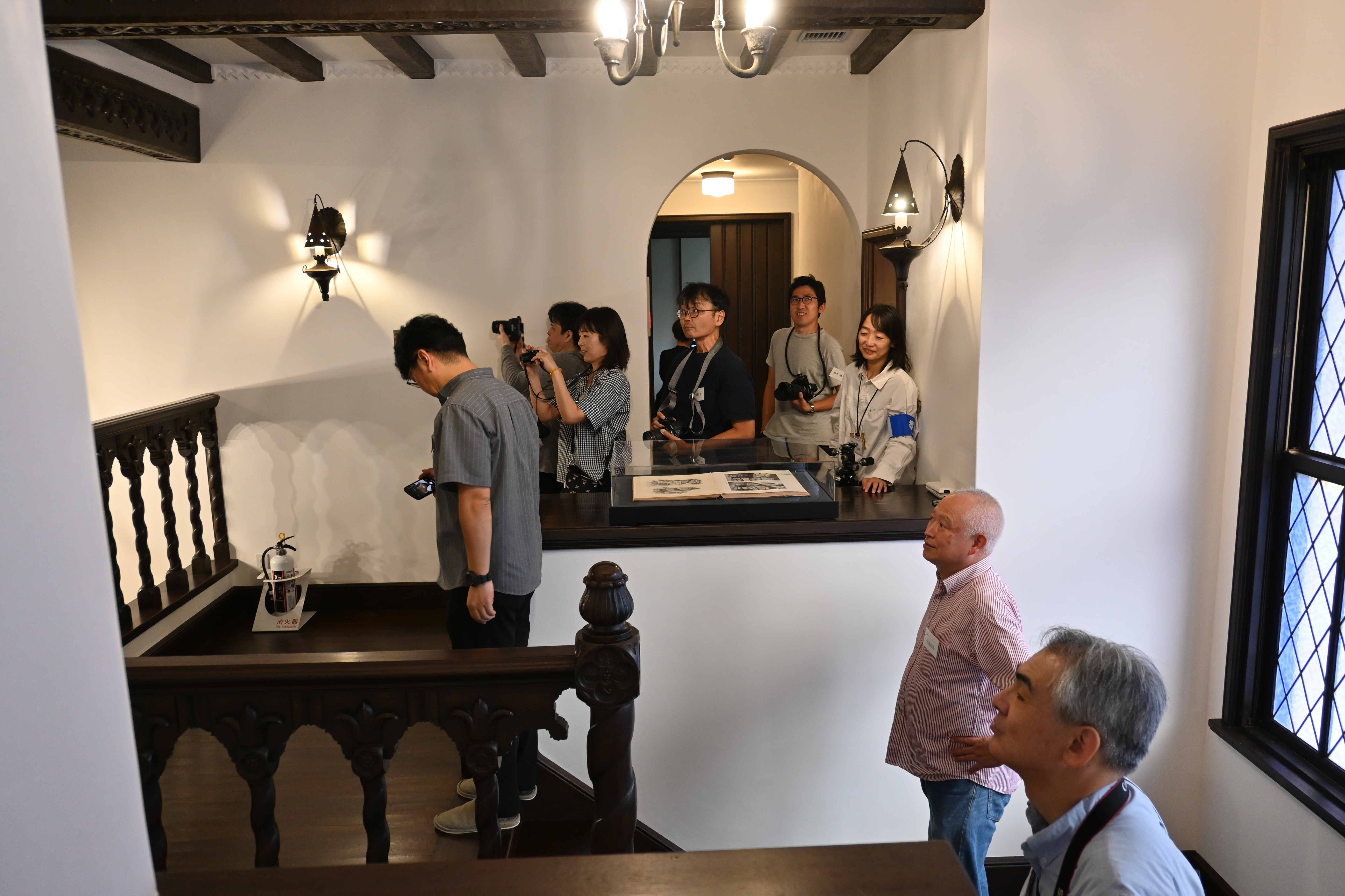 午前の部は主に建築関係の一般の方々にご参加いただきました。多くの方が本格的なカメラをご持参され、中には傍島氏が驚くほど高性能な機材を持ち込まれる方もいらっしゃいました。最初は個々に撮影されていましたが、途中からは傍島氏に「夫人室撮影のポイント」「白い部屋の取り方」「狭い和室の床の間の撮影方法」「(エントランスホールなど)要素が多い部分の撮り方」、「泰山タイルをうまく撮るコツ」など、積極的に質問をされていました。最後は建築写真の加工方法など実務的な話題にも広がり、午前の部は盛況のうちに終了しました。