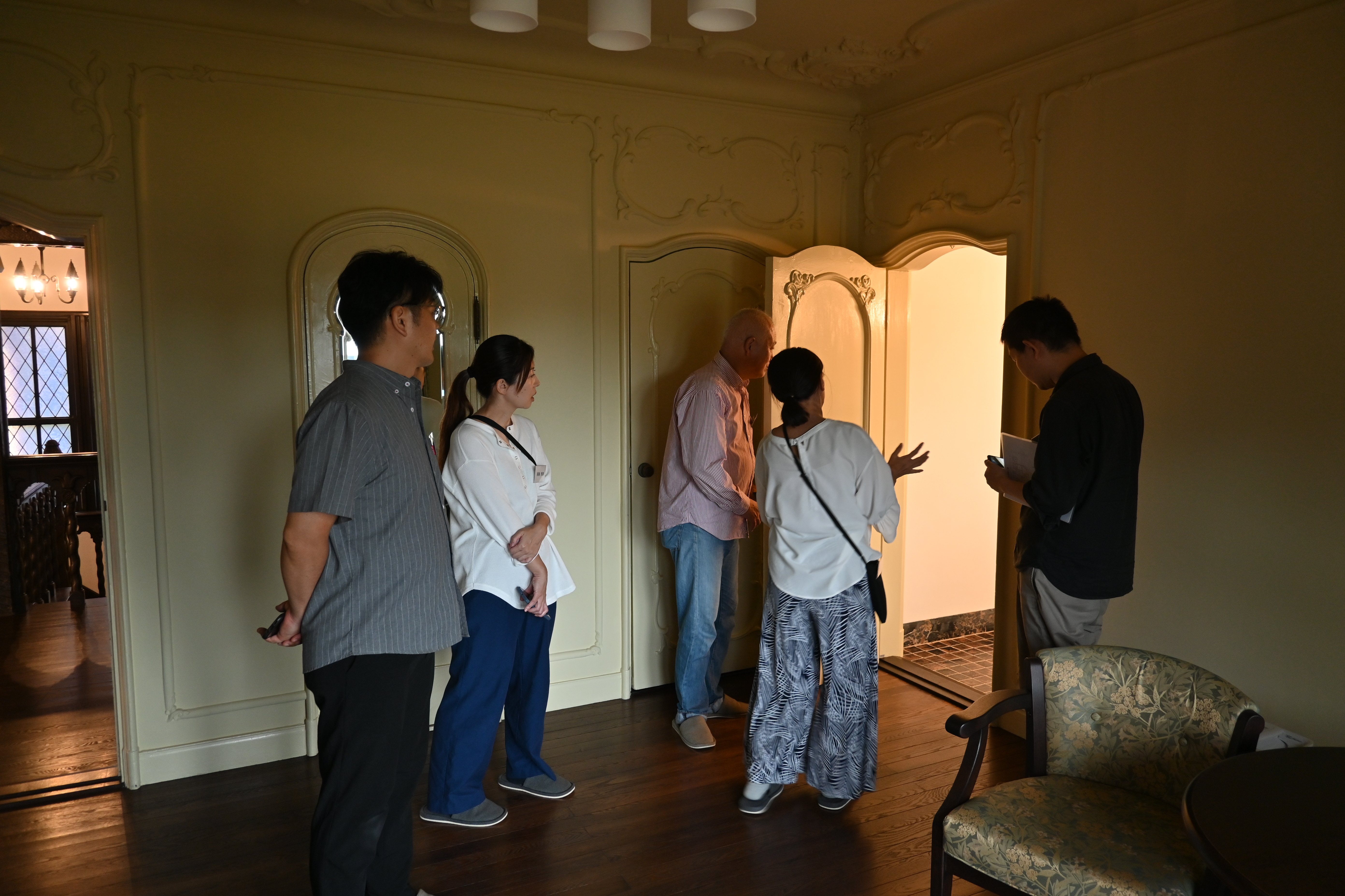 ▲2階夫人室の三越製作り付け家具を、どううまく撮影するか教えています